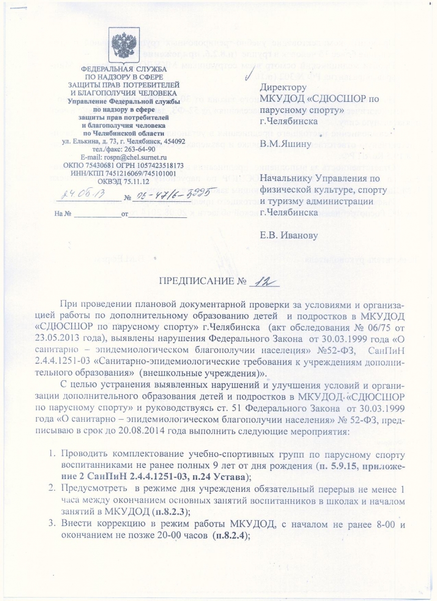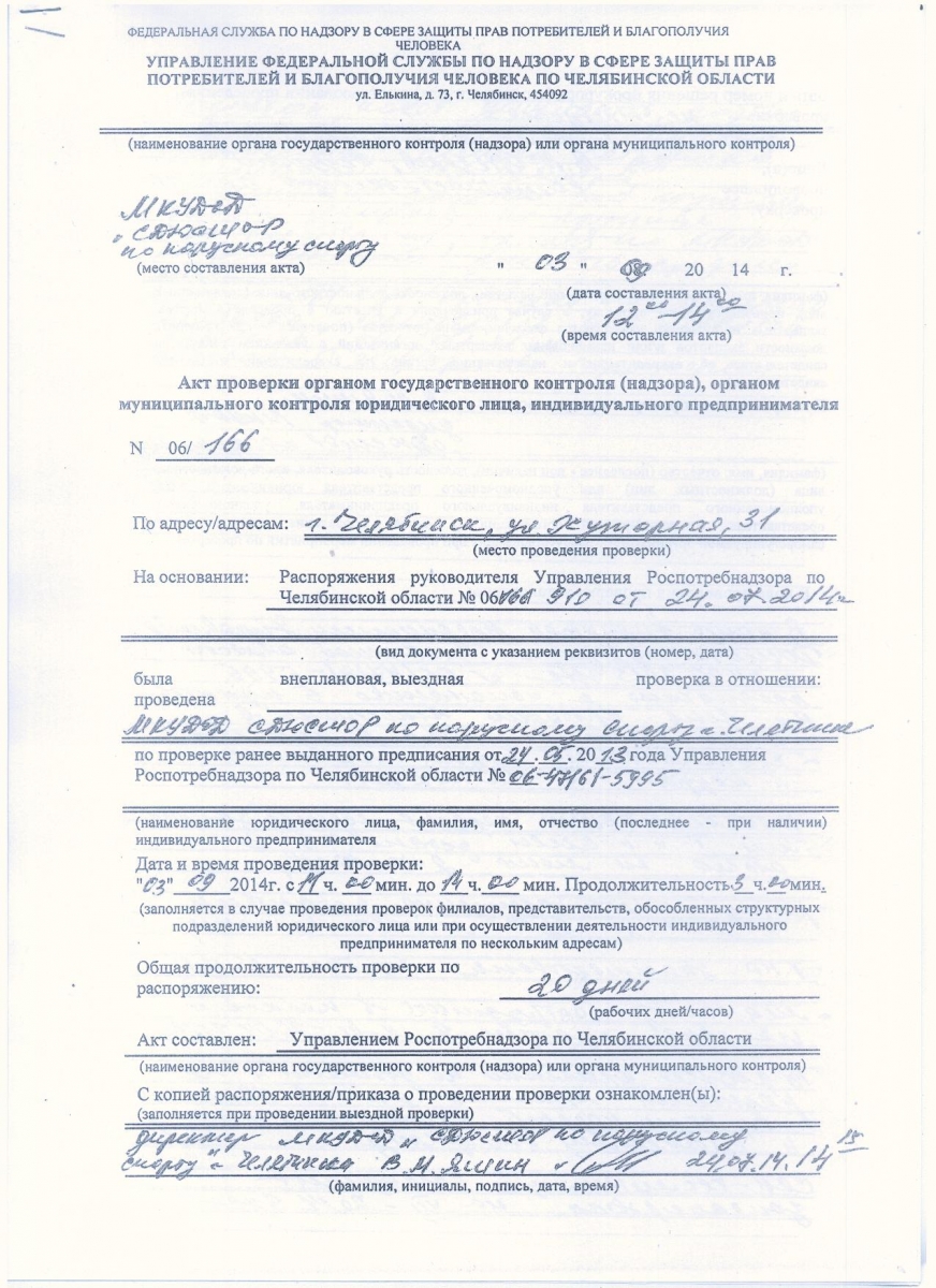 Выполнение предписания - УПРАВЛЕНИЕ ФЕДЕРАЛЬНОЙ СЛУЖБЫ ПО НАДЗОРУ В СФЕРЕ ЗАЩИТЫ ПРАВ ПОТРЕБИТЕЛЕЙ И БЛАГОПОЛУЧИЯ ЧЕЛОВЕКА ПО ЧЕЛЯБИНСКОЙ ОБЛАСТИ - 2
